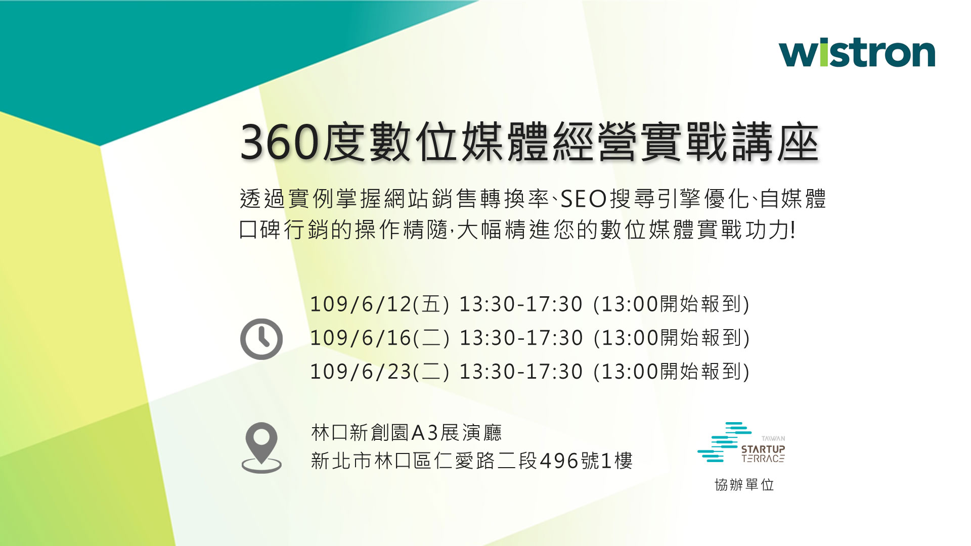 緯創資通(Wistron) 與林口新創園(Startup Terrace)攜手合作,邀請資深網路行銷顧問鄔竣清講師,為新創團隊傳授360度數位媒體經營課程,為期三天的精華系列課程,讓您透過實例掌握網站銷售轉換率、SEO搜尋引擎優化、自媒體口碑行銷的操作精隨,大幅精進您的數位媒體實戰功力!