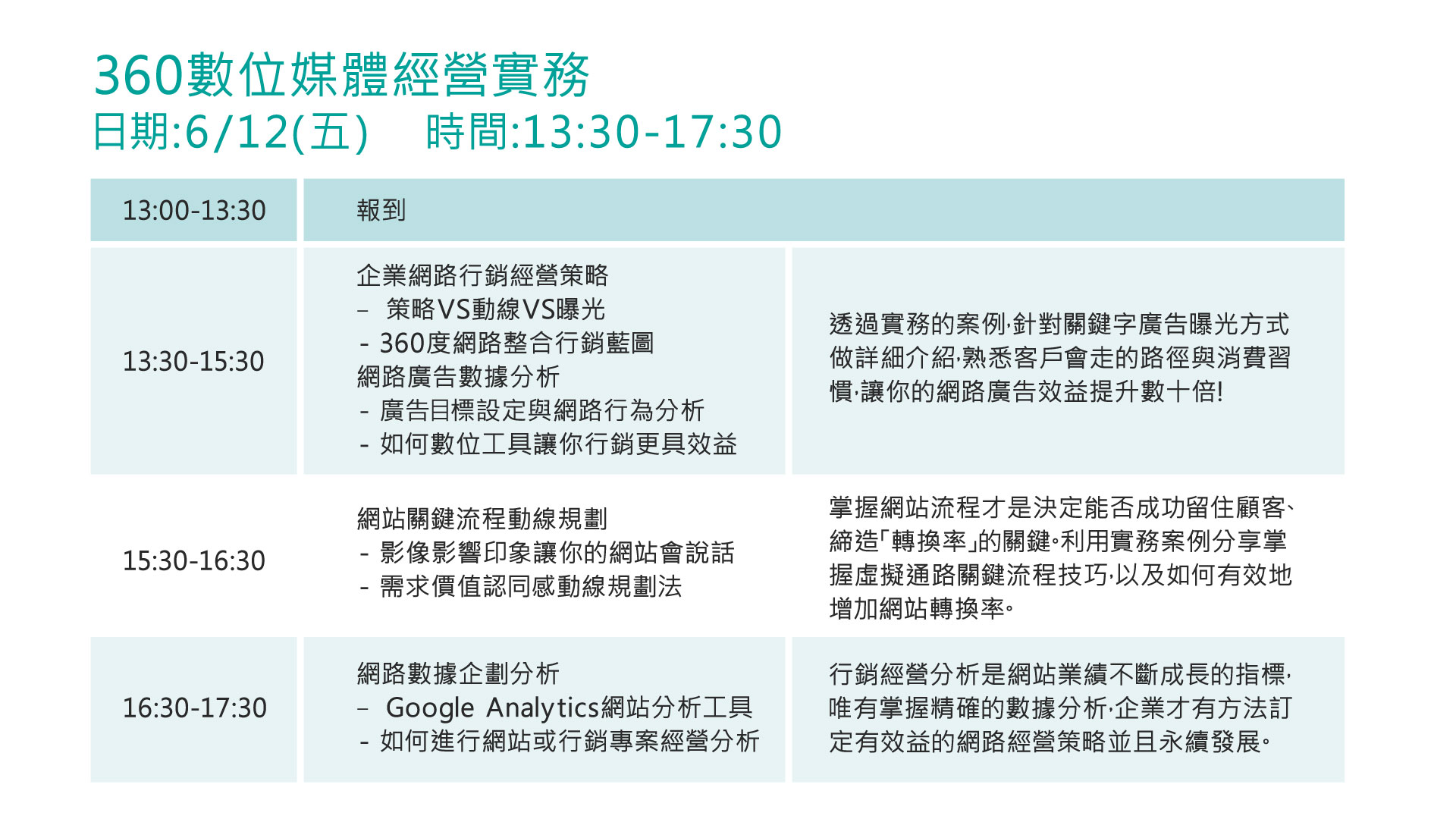 109/6/12(五) 13:30-17:30 360數位媒體經營實務