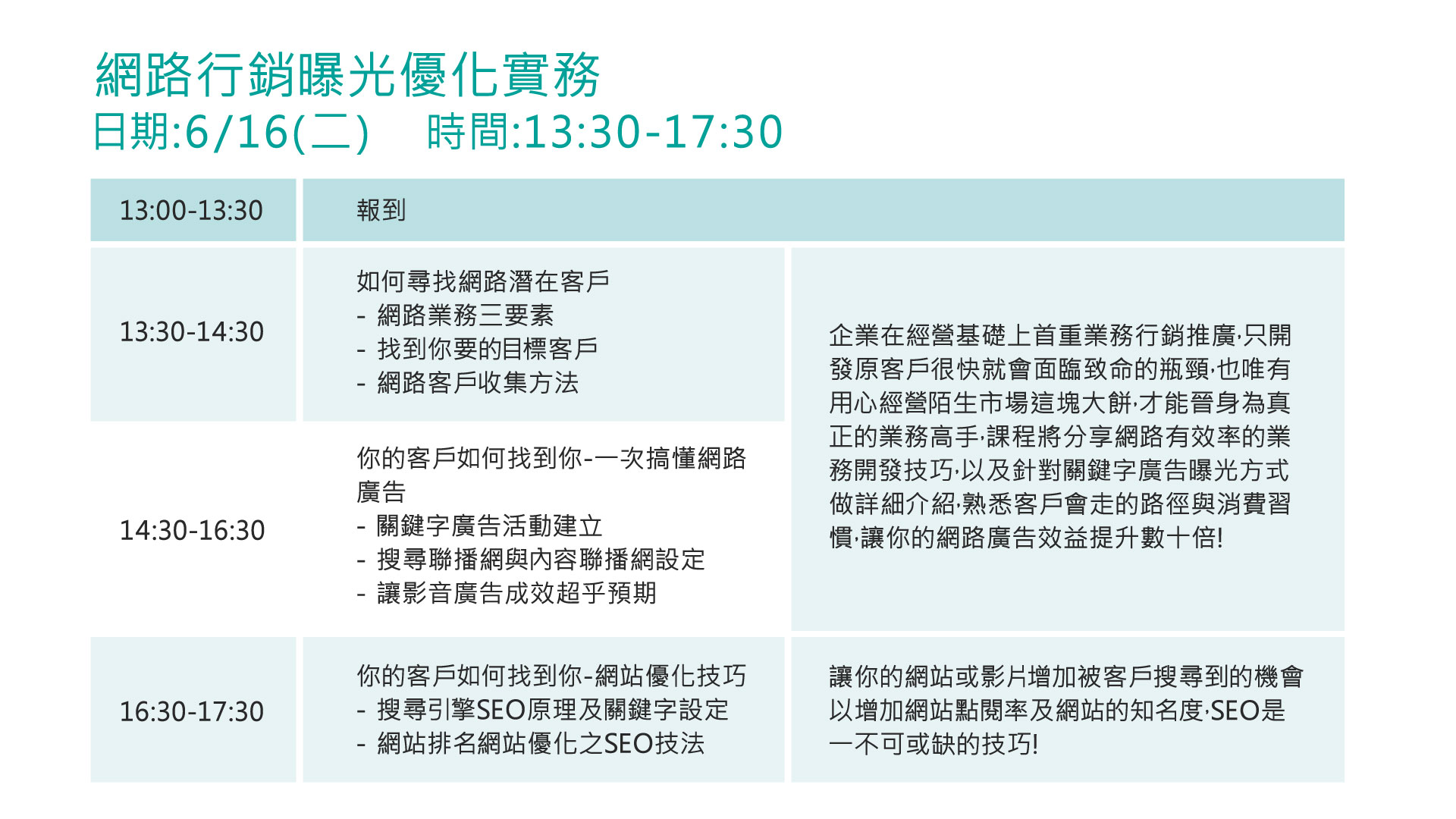 109/6/16(二) 13:30-17:30 網路行銷曝光優化實務