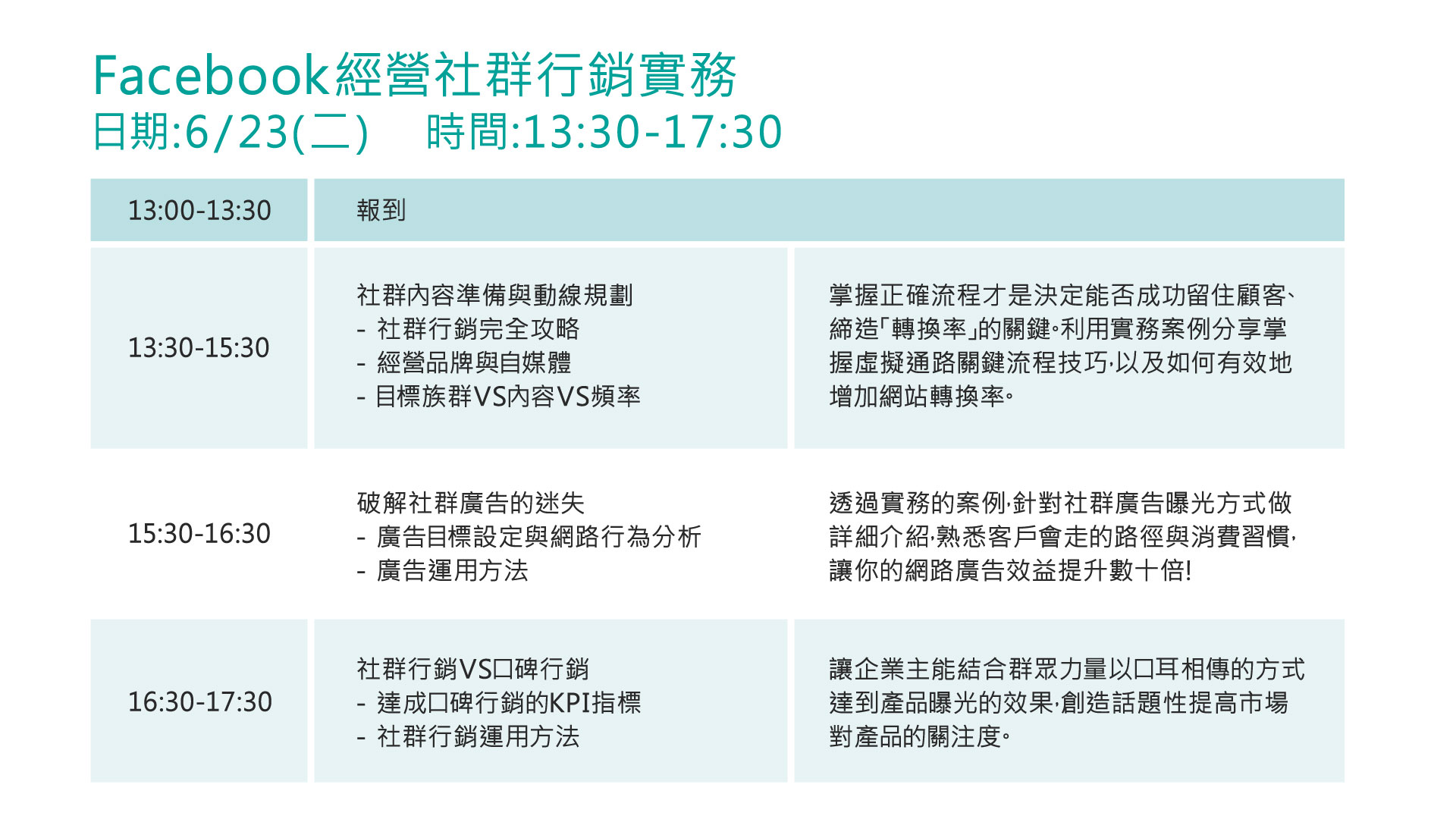 109/6/23(二) 13:30-17:30 Facebook經營社群行銷實務