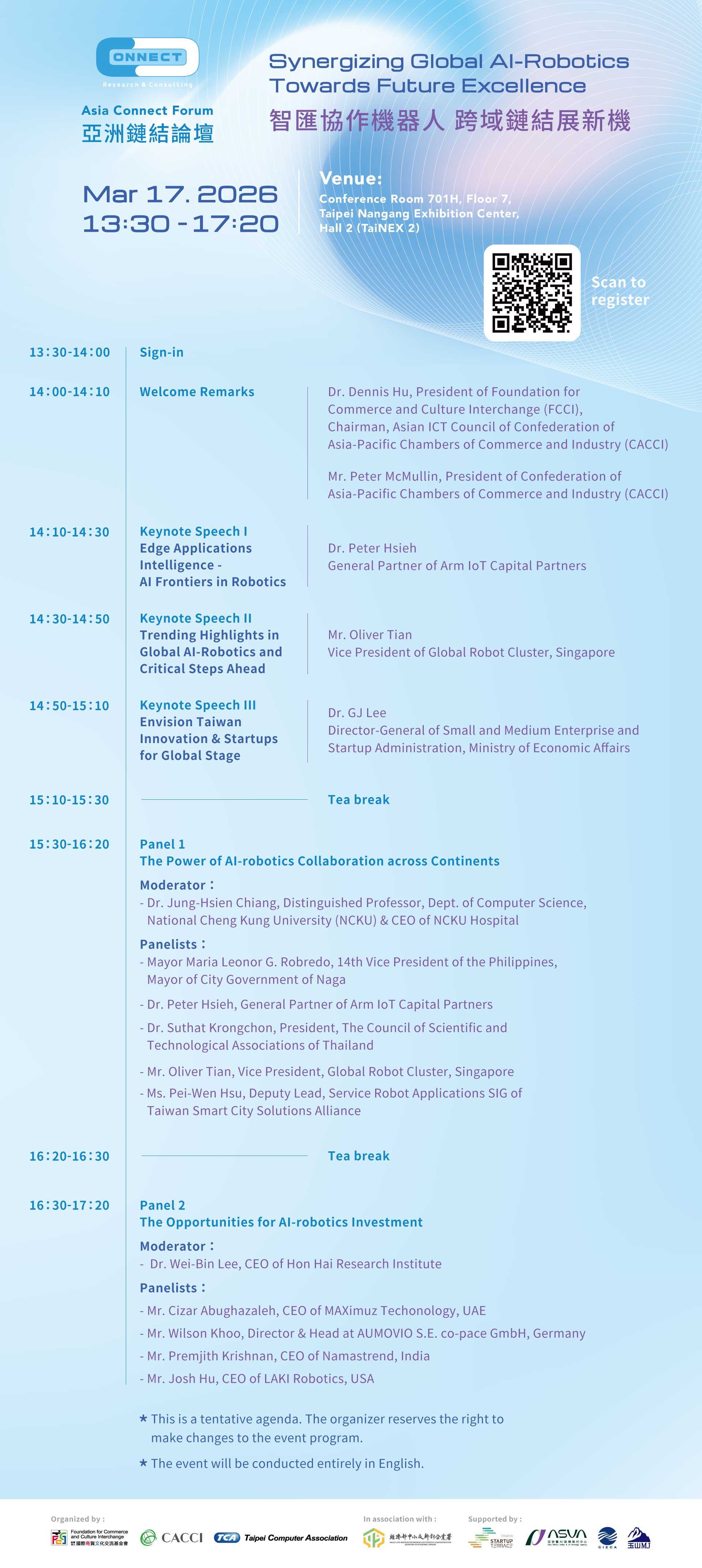 誠摯邀請您參與「2026 亞洲鏈結論壇 — 智匯協作機器人 跨域鏈結展新機」,本論壇將匯聚來自亞洲、歐美與中東的重要產業與投資領袖,共同探討 AI-robotics 的全球發展趨勢、應用落地與投資布局機會。