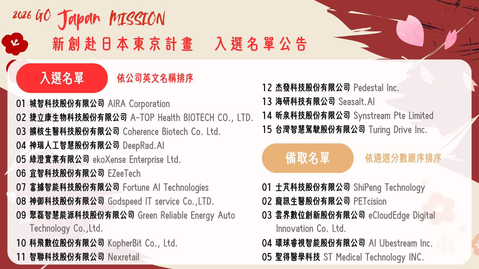 感謝新創團隊積極報名參與,遴選結果出爐!本計畫獲選15組正取新創團隊名單如下(依公司英文名稱字母排序):城智科技股份有限公司AIRA Corporation捷立康生物科技股份有限公司A-TOP Health BIOTECH CO., LTD.擴核生醫科技股份有限公司Coherence Biotech ...更多