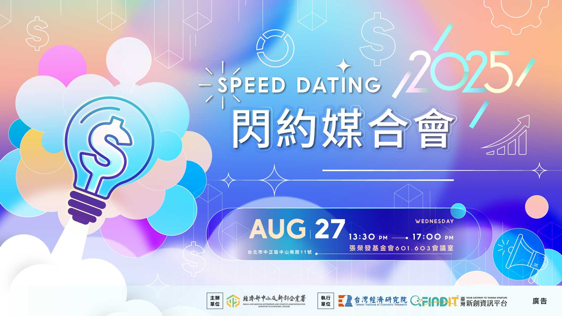 - Investor Registration:https://to.findit.org.tw/7nq9nl (Deadline: July 2, 12:00 pm) Please read the notification carefully. To know more about the attending investors this time, please refer to https://angelsummit.tier.org.tw/eng/speeddating.html